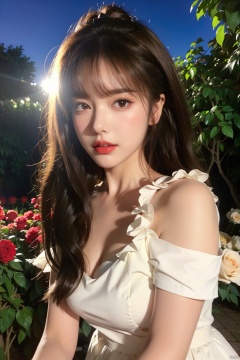 1 girl,solo,dress,flowers,white dress,long hair,fluffy sleeves,red flowers,short sleeves,roses,outdoor,sky,brown hair,natural,fluffy short sleeves,red lips,plants,lips,black hair,curly hair,trees,standing,shrubs,parted lips,red roses,(smoke),light,(night),,,