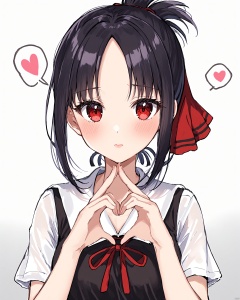 1girl, bad_id, bad_twitter_id, black_dress, black_hair, blush, breasts, closed_mouth, commentary, dress, eyelashes, fingers_together, gradient_background, grey_background, hair_ribbon, heart, heart_hands, highres, kaguya-sama_wa_kokurasetai_~tensai-tachi_no_renai_zunousen~, lips, looking_at_viewer, medium_breasts, medium_hair, motobi_\(mtb_umk\), neck_ribbon, parted_bangs, red_eyes, red_ribbon, ribbon, school_uniform, shinomiya_kaguya, short_ponytail, short_sleeves, shuuchiin_academy_school_uniform, simple_background, solo, spoken_heart, summer_uniform, twitter_username, upper_body, white_background