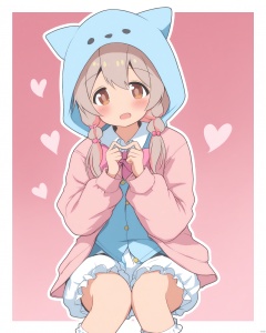 onii-chan_wa_oshimai!,1girl, animal_hood, bloomers, blue_bow, blush, border, bow, bowtie, brown_eyes, buttons, frilled_socks, frills, genderswap, genderswap_\(mtf\), gradient_background, grey_hair, hair_bobbles, hair_bow, hair_ornament, hair_over_shoulder, heart, highres, hood, hood_up, index_fingers_together, jacket, looking_at_viewer, multi-tied_hair, onii-chan_wa_oshimai!, open_mouth, outline, oyama_mahiro, pink_background, pink_bow, pink_bowtie, pink_hair, pink_jacket, sitting, socks, solo, star_\(symbol\), tareme, underwear, unkimo, white_bloomers, white_border, white_outline, white_socks, yellow_background