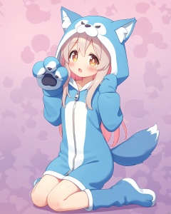 onii-chan_wa_oshimai!,1girl, :o, absurdres, animal_costume, animal_ears, animal_hands, barefoot, blush, brown_eyes, colored_inner_hair, commentary_request, fake_animal_ears, fake_tail, full_body, gloves, grey_hair, hair_between_eyes, highres, hood, hood_up, kneeling, long_hair, looking_at_viewer, multicolored_hair, onesie, onii-chan_wa_oshimai!, open_mouth, oyama_mahiro, paw_gloves, paw_print, paw_print_background, pink_hair, solo, tail, tokoshibyra, two-tone_hair, wolf_costume, wolf_hood, wolf_tail, zipper_pull_tab