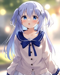 gochuumon_wa_usagi_desu_ka?,1girl, \:o, absurdres, bad_id, bad_pixiv_id, blue_eyes, blue_hair, blue_ribbon, blurry, blurry_background, blush, collarbone, commentary_request, depth_of_field, gochuumon_wa_usagi_desu_ka?, hair_between_eyes, hair_ornament, highres, kafuu_chino, light_blue_hair, long_hair, long_sleeves, looking_at_viewer, mousou_\(mousou_temporary\), open_mouth, pleated_skirt, ribbon, skirt, sleeves_past_wrists, solo, two_side_up, white_skirt, x_hair_ornament