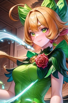 Seer, 1girl, green eyes, solo, ahoge, long hair, bow, smile, hair bow, jewelry, blonde hair, bracelet, flower, rose, green bow, bangs, closed mouth, short sleeves, red flower, dress, shorts, red rose, bangle, green dress, thick eyebrows, glowing, animal ears, looking_at_viewer,sitting,arms behind back,(upper_body:1.5),