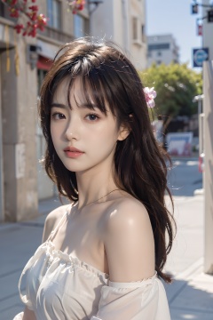 1girl,solo,long hair,realistic,lips,parted lips,upper body,blurry background,floating petals,jitome,cute,Street background,short hair,masterpiece,high quality,best quality),(colorful:0.85),(delicate eyes and face),volumatic light,ray tracing,extremely detailed CG unity 8k wallpaper,solo, indoors, palace, lights, window, decorations,(ahoge:1.3),best quality,official art,(((light from the sky))),floating hair,light shines on hair,whultra-detailed,(((extremely detailed cg 8k wallpaper))),(crystalstexture skin:1.4),(extremely delicate and beautiful),(white skin),looking_at_viewer,kinghere fensejiaren,,realistic, <lora:20240212-1707682573619:0.75> <lora:Body_shaping:0.35>