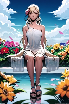 best quality, masterpiece, illustration, (reflection light), incredibly absurdres, ((Movie Poster), (signature:1.3), (English text), 1girl, girl middle of flower, pure sky,yellow hair, red eyes, twintails,clear sky, outside, collarbone, sitting, absurdly long hair, clear boundaries of the cloth, white dress, fantastic scenery, ground of flowers, thousand of flowers, colorful flowers, flowers around her, various flowers,bare shoulders,skirt, sandals,