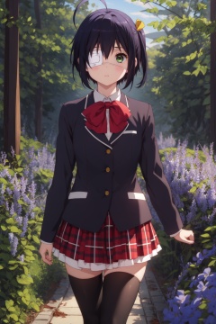 <lora:Rikka-000006:0.8>,Rikka CYQL,1girl,looking at viewer,solo,black hair,short hair,ahoge,ribbon,yellow ribbon,one side up,green eyes,eyepatch,medical eyepatch,red bow,school uniform,bowtie,shirt,skirt,thighhighs,plaid skirt,zettai ryouiki,plaid,shoes,blazer,black thighhighs,jacket,blush,smug,full_shot,Forest, Bluebells, Trees, Flowers, Spring, Colors, Serenity, Beauty,(Heather blooms, Coastal cliffs, Ocean views, Coastal breeze, Heather carpet, Cliffside panorama:0.5),beautiful detailed sky,beautiful detailed glow,posing in front of a colorful and dynamic background,masterpiece,best quality,beautiful and aesthetic,contrapposto,female focus,wallpaper,