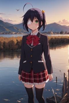 <lora:Rikka-000006:0.8>,Rikka CYQL,1girl,looking at viewer,solo,black hair,short hair,ahoge,ribbon,yellow ribbon,one side up,green eyes,eyepatch,medical eyepatch,red bow,school uniform,bowtie,shirt,skirt,thighhighs,plaid skirt,zettai ryouiki,plaid,shoes,blazer,black thighhighs,jacket,blush,light_blush,full_shot,Marshland, Sunrise, Birds, Water, Reeds, Reflection, Serenity, Colors,(Coastal wildflowers, Sand dunes, Coastal breeze, Wildflower explosion, Coastal landscape, Sunset hues:0.5),beautiful detailed sky,beautiful detailed glow,posing in front of a colorful and dynamic background,masterpiece,best quality,beautiful and aesthetic,contrapposto,female focus,wallpaper,