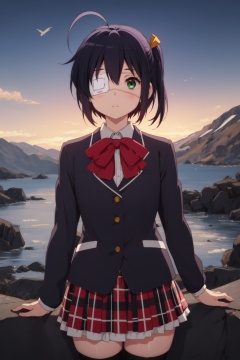<lora:Rikka-000006:0.8>,Rikka CYQL,1girl,looking at viewer,solo,black hair,short hair,ahoge,ribbon,yellow ribbon,one side up,green eyes,eyepatch,medical eyepatch,red bow,school uniform,bowtie,shirt,skirt,thighhighs,plaid skirt,zettai ryouiki,plaid,shoes,blazer,black thighhighs,jacket,blush,smirk,upper_body,Volcano, Lava, Ash, Crater, Smoke, Rocks, Seabirds, Magma,(Japanese maples, Tea house, Stone lanterns, Koi pond, Fall foliage, Tranquil retreat:0.5),beautiful detailed sky,beautiful detailed glow,posing in front of a colorful and dynamic background,masterpiece,best quality,beautiful and aesthetic,contrapposto,female focus,wallpaper,