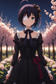 <lora:Rikka-000006:0.8>,Rikka CYQL,1girl,looking at viewer,solo,black hair,short hair,ahoge,ribbon,one side up,green eyes,eyepatch,medical eyepatch,dress,lolita fashion,long sleeves,crazy_smile,full_shot,Orchard, Apples, Blossoms, Spring, Trees, Colors, Serenity, Harvest,(Alpine flowers, Mountain peaks, Alpine meadow, Summer blooms, Alpine landscape, Mountain breeze:0.5),beautiful detailed sky,beautiful detailed glow,posing in front of a colorful and dynamic background,masterpiece,best quality,beautiful and aesthetic,contrapposto,female focus,wallpaper,