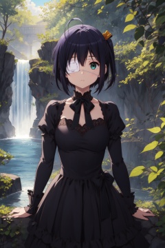 <lora:Rikka-000006:0.8>,Rikka CYQL,1girl,looking at viewer,solo,black hair,short hair,ahoge,ribbon,one side up,green eyes,eyepatch,medical eyepatch,dress,lolita fashion,long sleeves,smug,portrait,Waterfall, Jungle, Hidden, Serenity, Mist, Trees, Rocks, Discovery,(Coastal wildflowers, Sand dunes, Coastal breeze, Wildflower explosion, Coastal landscape, Sunset hues:0.5),beautiful detailed sky,beautiful detailed glow,posing in front of a colorful and dynamic background,masterpiece,best quality,beautiful and aesthetic,contrapposto,female focus,wallpaper,