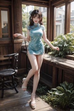 best quality, masterpiece,Depth of field,kind smile,looking_at_viewer,Dynamic pose,RAW photo,1girl,Xcheongsam,full body,(big breasts:1.39),ping-blue dress,hand101