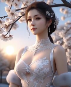 <lora:588-DA-XL-梦塔·雪谜城-白亦君:0.8>(,1girl, ,best quality, ),looking at viewer,  ,, ultra detailed background,ultra detailed background,ultra realistic 8k cg,,masterpiece, (( , )), fiction,mole,  ,     ,see-through, lace, (cleavage),(((, solo, sun, , bare_tree, )))