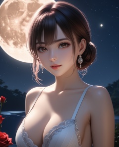 (,1girl, ,best quality, ),looking at viewer,masterpiece, (( , )),, realistic,science fiction,mole, ultra realistic 8k cg, moonlight,full moon,  rose,(cleavage), (),