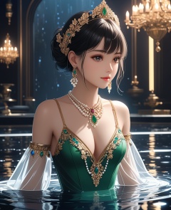 (,1girl, ,best quality, ),looking at viewer,  ,ultra detailed background,ultra detailed background,ultra realistic 8k cg,, ,masterpiece,((((1girl, solo,  , solo focus, ,walking on liquid, ))))    (cleavage), (), ,ultra realistic 8k cg,   clean, masterpiece,     cinematic lighting, cinematic bloom, , (( , )),,  , unreal, science fiction, luxury, jewelry, diamond, gold, pearl, gem, sapphire, ruby, emerald, intricate detail, delicate pattern, charming, alluring, seductive, erotic, enchanting, hair ornament, necklace, earrings, bracelet, armlet,see-through sleeves, ,