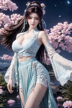 Surrealism Dream Style,glowing neon color,RAW photo,at night,1girl,solo,sea,black hair,ponytail,looking at viewer,long hair,up,lips,sash,water splaashing,hair ornament,realistic,wide sleeves,hanfu,long dress,Semi transparent gauze skirt,surrealist,Best quality,masterpiece,ultra high res,Petal skirt,wind,flowers,bloom,Clouds,smoke,neon lights, 1 girl,(huge breasts:1.89), Xcheongsam, Yunxiao_xianzi,medusa,Xtianxiwei,