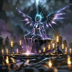 lineart,a big angel sitting on a platform with a candle, in the style of dark fantasy creatures, sergey musin, nightcore, dark, foreboding colors, vanitas, greg rucka, powerful symbolism
