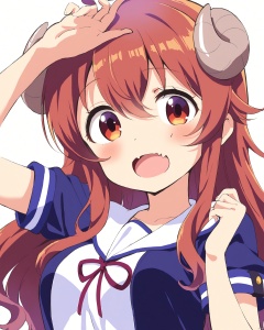 machikado_mazoku,1girl, arm_up, blush, commentary, curled_horns, demon_girl, demon_horns, fang, hair_between_eyes, hand_on_own_head, hand_up, highres, horns, long_hair, looking_at_viewer, machikado_mazoku, neki_\(wakiko\), open_mouth, red_eyes, red_hair, short_sleeves, simple_background, skin_fang, solo, upper_body, white_background, yoshida_yuuko_\(machikado_mazoku\)