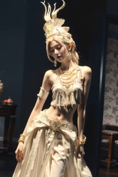 (masterpiece, top quality, best quality, official art, beautiful and aesthetic:1.2), cinematic light, Dynamic Angle, cinematic angle,Perspective, High Point, high resolution,unity 8k wallpaper, highest detailed,wonder,outline,intricate details,((wallpaper)),dehuabaici,1girl,closed eyes,jewelry,skin made of porcelain,solo, dress, miaoyuansu, hair ornament, headgear, hat, earrings, jewelry, bracelet, necklace, upper body, bare shoulders, looking at viewer, dancing, belt,backlighting, from below, wide shot,soft, <lora:miaoyuansu-000009:0.5> <lora:dehuabaici-000010:0.95>