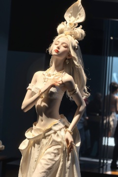 (masterpiece, top quality, best quality, official art, beautiful and aesthetic:1.2), cinematic light, Dynamic Angle, cinematic angle,Perspective, High Point, high resolution,unity 8k wallpaper, highest detailed,wonder,outline,intricate details,((wallpaper)),dehuabaici,1girl,closed eyes,jewelry,skin made of porcelain,solo, dress, miaoyuansu, hair ornament, headgear, hat, earrings, jewelry, bracelet, necklace, upper body, bare shoulders, looking at viewer, dancing, belt,backlighting,  from below, wide shot,soft, <lora:miaoyuansu-000009:0.3> <lora:dehuabaici-000010:0.95>