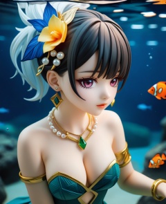 (,1girl, ,best quality, ),looking at viewer,masterpiece, ((((, solo,  , ,solo focus, ,underwater, )))) ,ultra realistic 8k cg,   clean, masterpiece,     cinematic lighting, cinematic bloom,  (( , )),, , unreal, science fiction, luxury, jewelry, diamond, gold, pearl, gem, sapphire, ruby, emerald, intricate detail, delicate pattern, charming, alluring, seductive, erotic, enchanting, hair ornament, necklace, earrings, bracelet, armlet,,(cleavage),
