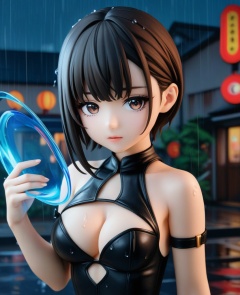 (,1girl, ,best quality, ),looking at viewer,masterpiece, (( , )),,ultra realistic 8k cg, ,      ,building, bare_shoulders,cleavage cutout, eyelashes,magic,hydrokinesis,sweat, wet, rain, ,       (cleavage), (),