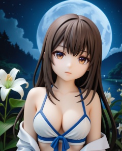 (,1girl, ,best quality, ),looking at viewer,  ,ultra detailed background,ultra detailed background,ultra realistic 8k cg, , ,masterpiece, (( , )),, ultra realistic 8k cg, ,      ,lily \(flower\) ,full moon ,strawberry blossoms      (cleavage), (),