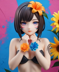 (,1girl, ,best quality, ),looking at viewer,  ,,ultra detailed background,ultra detailed background,ultra realistic 8k cg,, ,masterpiece, (( , )),ultra realistic 8k cgSurrounded by strange, movie perspective, advertising style, Colorful background, splash of color A beautiful woman with delicate facial features,tattoo all over body, flower arms,