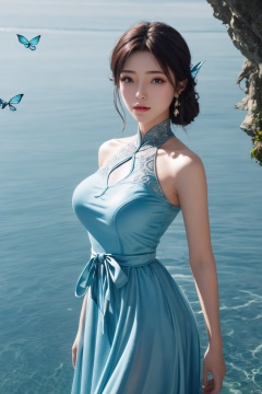 (1girl,best quality, ),looking at viewer,(big breasts),Xxiaoxuner,blue dress, 80sDBA style, Water_butterfly