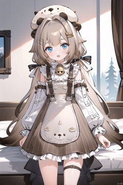 1girl, solo, bangs, blue eyes, brown hair, hair ornament, long sleeves, hat, dress, animal ears, multicolored hair, bell, thigh strap, neck bell, brown dress, low twintails, Shiori, bedroom,
