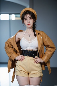 1girl, reisalin_stout, red_shorts, breasts, jewelry, brown_hair, shorts, gloves, solo, large_breasts, short_shorts, thighhighs, cleavage, necklace, braid, thigh_strap, key_necklace, hat, white_headwear, earrings, partially_fingerless_gloves, open_mouth, single_thighhigh, thighs, belt, brown_eyes, short_hair, jacket, bare_shoulders, blush, yellow_jacket, key, single_sidelock, bangs, looking_at_viewer, beret, sleeveless, black_ribbon, :o, black_thighhighs, sweat, side_braid, brown_belt, leather_belt, shirt, grey_background, leather_gloves, pouch, ribbon, black_gloves, white_shirt, brown_gloves, collarbone, thick_thighs, hand_on_hip, sleeveless_jacket, hair_ornament, maolilan,moyou, wangyushan, ((poakl))