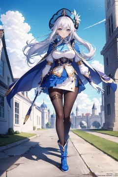 1girl, clorinde \(genshin impact\), tricorne, pantyhose, earrings, blue cape, white gloves, pencil skirt, white shirt, thigh strap, underbust, ascot, boots, jacket, depth of field, full body, walking, hand in own hair, looking at viewer, parted lips, floating hair, outdoors, castle