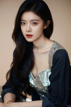 Surrealist beauty photo, a beautiful woman wearing complex and detailed colored clothes and future jewelry, low cut.,