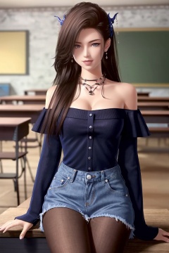 ((HRD, HUD, 8K)),((masterpiece, best quality)), highly detailed,1girl, solo, hair ornament, brown hair, black hair, long hair, brown eyes,necklace, jewelry, earrings, (off-shoulder sweater:1.2), denim shorts, black pantyhose, blurry background, classroom, chalkboard, sitting, cowboy shot, looking at viewer, <lora:20240525-1716650918118:0.7>