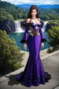 ((HRD, HUD, 8K)),((masterpiece, best quality)), highly detailed,1girl, solo, hair ornament, brown hair, black hair, long hair, brown eyes,necklace, jewelry, earrings, breasts, cleavage, bare shoulders, detached sleeves, dress, purple dress, simple background, mountain, waterfall, full body, long legs, standing, looking at viewer, <lora:20240525-1716650918118:0.73>