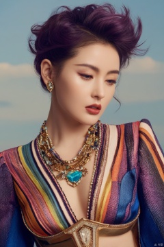 Surrealist beauty photo, a beautiful woman wearing complex and detailed colored clothes and future jewelry, low cut.,