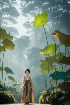Serene Hanfu-clad beauty stands tall against lush Lotus Leaf Background, flowing skirt and long sleeves billowing in gentle breeze. Lush lotus leaves stretch towards sky in distance. Wide shot captures striking figure amidst serene landscape, leafy scenery subtly emphasizing elegance.YT lotus leaf<lora:EMS-383583-EMS:0.800000>