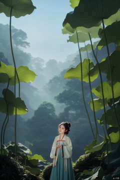 Serene Hanfu-clad beauty stands tall against lush Lotus Leaf Background, flowing skirt and long sleeves billowing in gentle breeze. Lush lotus leaves stretch towards sky in distance. Wide shot captures striking figure amidst serene landscape, leafy scenery subtly emphasizing elegance.YT lotus leaf<lora:EMS-383515-EMS:0.800000>
