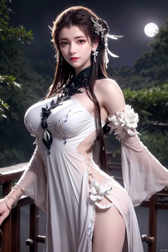 outdoor,(large breasts:1.2),flowers,floating hair,sky,rainbow,moon,sky,stars,(arms at sides:1),(rstanding:1.3),bamboo forest,river,1girl, solo, hair ornament, dress, brown hair, white dress, jewelry, earrings, upper body, braid, looking at viewer, long hair,official art,extremely detailed cg 8k wallpaper,looking at viewer,(extremely delicate and beautiful),realistic, photo_\(medium\),,Xbaiyijun