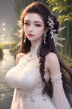 outdoor,(large breasts:1.29),flowers,floating hair,sky,rainbow,full moon,sky,stars,(arms at sides:1),(rstanding:1.3),bamboo forest,river,1girl, solo, hair ornament, dress, brown hair, white dress, jewelry, earrings, upper body, braid, looking at viewer, long hair,official art,extremely detailed cg 8k wallpaper,looking at viewer,(extremely delicate and beautiful),realistic, photo_\(medium\),,Xbaiyijun