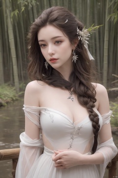 outdoor,(large breasts:1.29),flowers,floating hair,sky,rainbow,full moon,sky,stars,(arms at sides:1),(rstanding:1.3),bamboo forest,river,1girl, solo, hair ornament, dress, brown hair, white dress, jewelry, earrings, upper body, braid, looking at viewer, long hair,official art,extremely detailed cg 8k wallpaper,looking at viewer,(extremely delicate and beautiful),realistic, photo_\(medium\),,Xbaiyijun