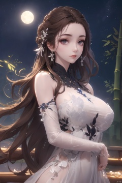 outdoor,(large breasts:1.29),flowers,floating hair,sky,rainbow,full moon,sky,stars,(arms at sides:1),(rstanding:1.3),bamboo forest,river,1girl, solo, hair ornament, dress, brown hair, white dress, jewelry, earrings, upper body, braid, looking at viewer, long hair,official art,extremely detailed cg 8k wallpaper,looking at viewer,(extremely delicate and beautiful),realistic, photo_\(medium\),,Xbaiyijun,Ancient costume