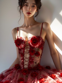A photograph capturing a long shot of a Chinese girl in a realistic full-body pose,wearing a red rose-patterned bustier dress,lit by sunlight,on a white background,<lora:Rose Girl:0.8>,full_shot,plump,<lora:FashionGirl:0.3>,, (((masterpiece))), (((best quality))), ((ultra-detailed)), Hyper Real,Photorealistic,16K,high detail,high,resolutionBest quality, masterpiece, ultra high res, (photorealistic:1.4), raw photo,