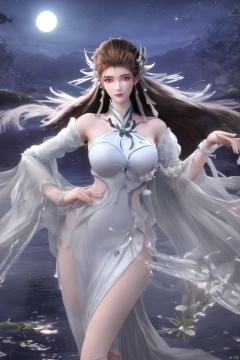 outdoor,(large breasts:1.29),flowers,floating hair,sky,rainbow,full moon,sky,stars,bamboo forest,river,1girl, solo, hair ornament, dress, jewelry looking at viewer, long hair,official art,looking at viewer,(extremely delicate and beautiful),Xbaiyijun,