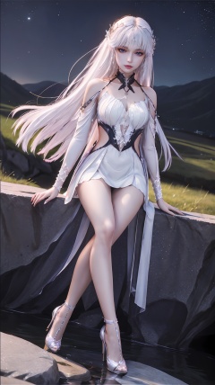 ((masterpiece)),((best quality)),wallpaper,ce,1girl,solo,breasts,white hair,long hair,bare shoulders,white dress,a slim figure,long hair,split long sleeves,dynamic_pose,,night,madotsuki,starry_sky,strappy_heels,depth of field,facial polishing,delicate skin,reflective eye shadow,full_body,tanono,fluorescence,in a meadow,mizu,river,rock,sitting on a stone,sitting,scythe,holding_scythe,<lora:QYpifuV1:1>
