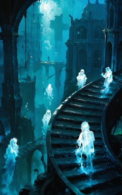 best quality, masterpiece, (ultra-detailed:1.1), good background, oil painting, [<lora:EndlessSteps-v2-Kohaku-Tanger:0.75>::0.75], Endless Steps, Climbing stairs, CG, underwater, blue theme, air bubble, ruins, ghost, scenery, submerged, bubble, multiple others,a group of ghostly figures in a dark room,people in bright blue light walk on a deck