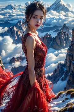 sdzs01,1girl,mountain,solo,cloud,red dress,black hair,looking at viewer,outdoors,blue sky,bare shoulders,cloudy sky,scenery,<lora:sdzs1.5:0.8>,, best quality, ultra-detailed, masterpiece, finely detail, highres, 8k wallpaper