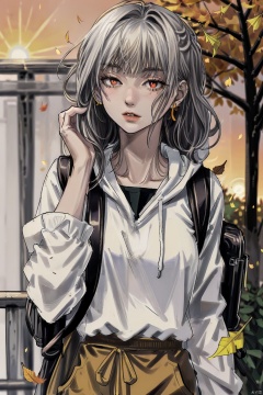 1girl, solo, best quality, white hair,orange theme, blurry background, falling leaves, holding leaf, parted lips, red eyes, long hair, brown hair, bangs, shirt, yellow hoodie, hood down, long sleeves, shoulder bag, backpack, necklace, school bag, outdoors, earbuds, fence, hand in pocket, tree, autumn leaves, drawstring, blurry foreground, depth of field, sunset, ginkgo leaf, orange sky, maple leaf, motion blur, fire
