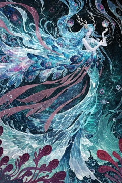 Eyes as deep as the starry sky,Mermaid, long flowing hair, love, best quality,Amazing,finely detail,Depth of field,extremely detailed CG unity 8k wallpaper,Deep sea background,jellyfish,masterpiece,fluttered detailed splashs, beautiful detailed water,cosmic eyes,Shock sensation,(realistic :0.5),octopus,original,