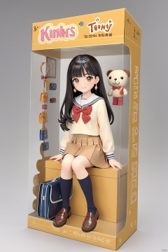 toy packaging design,1girl, school uniform, solo, long hair, sitting, socks, brown eyes, serafuku, bag, looking at viewer, loafers, school bag, skirt, kneehighs, black hair, sailor collar, black socks, bangs, jewelry, earrings, brown hair, bow, smile, long sleeves, brown footwear