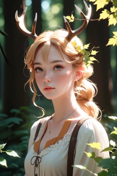 Vintage portrait, photography style, soft focus, pure face,Deer, girl, antlers, vine with leaves, Blonde hair, European and American advanced face, freckles, Detailed light and shadow, Wind, (Strong Sunshine),Two plaits, The forest,Front light source, , 1girl, 1 girl