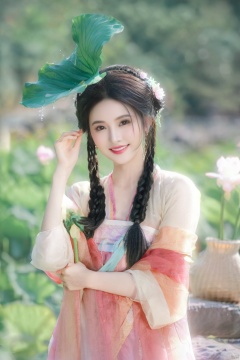 hanfu, 1girl, flower, solo, blurry, blurry background, braid, black hair, holding, twin braids, long hair, hair ornament, leaf, smile, earrings, outdoors, jewelry, chinese clothes, hair flower, lily pad, rock, day, looking at viewer, depth of field, water